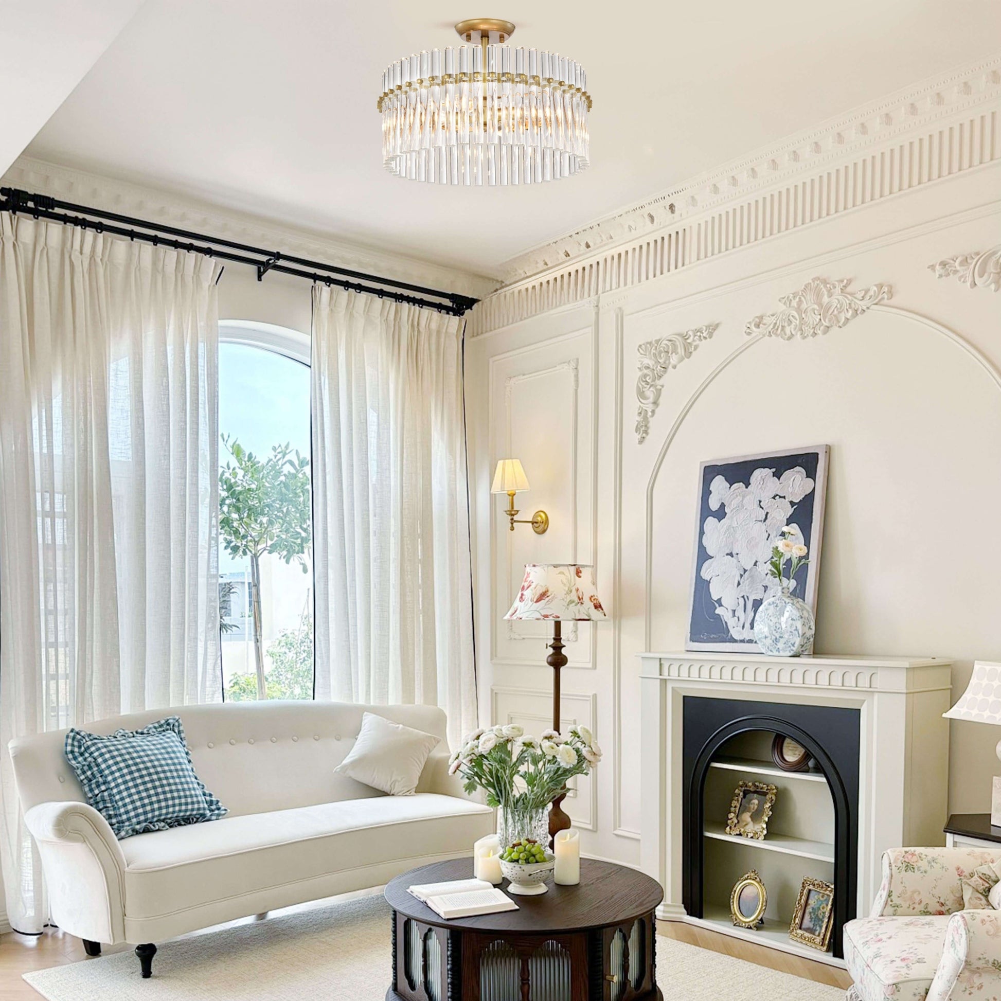 This 4-light flush mount fuses modern style with luxurious elements. The round canopy and ring are made from metal with a brushed brass finish. A ring supports the crystal glass rods that adds a touch of glam to your living space. The four 60W candelabra style bulbs (sold separately) are barely visible and cast a light that is artfully reflected off the shimmering crystals. This flush mount is LED compatible and is rated for both dry and damp locations, so you're able to install it just about anywhere.
