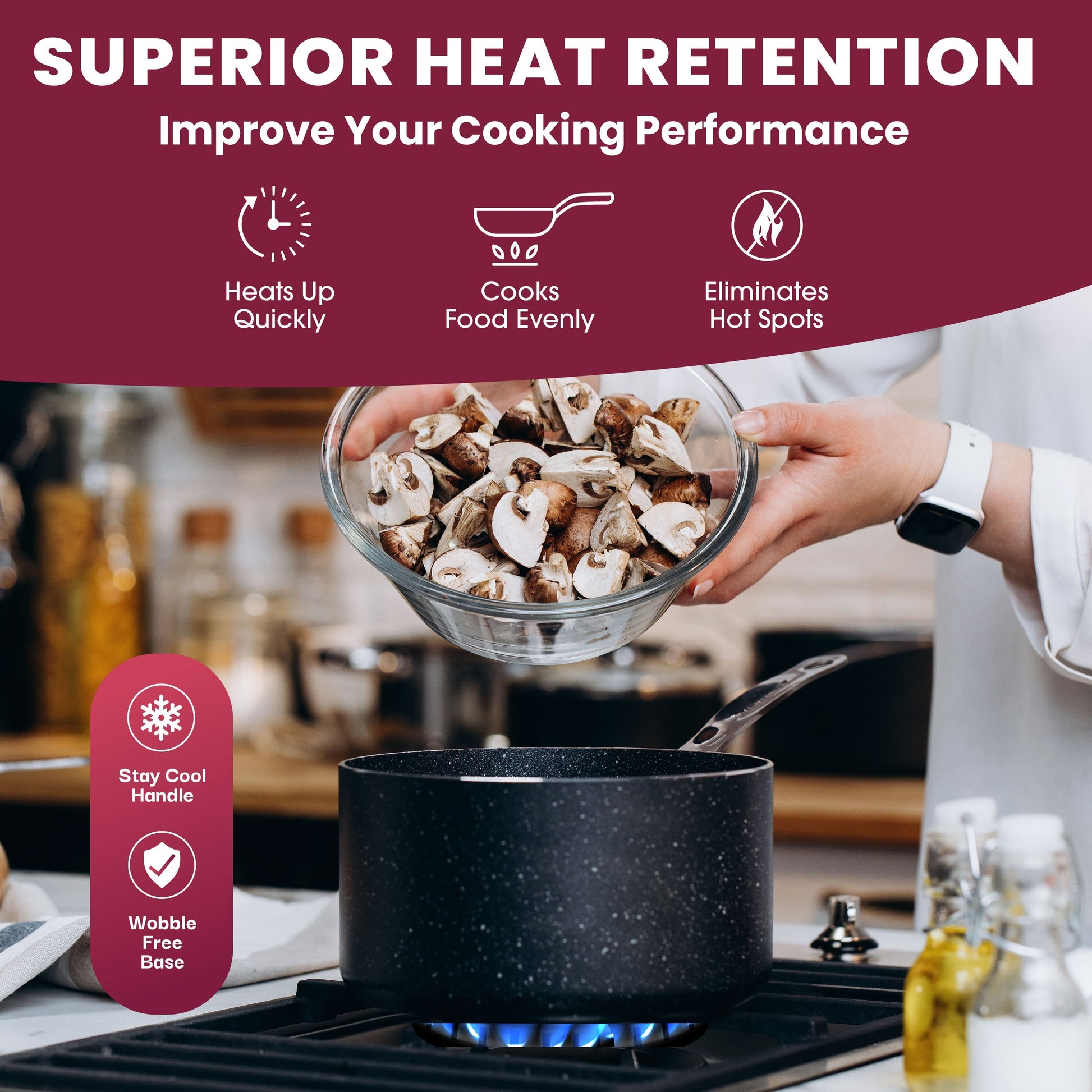 • Safe and Family Friendly: Made without PFOA, PFOS, lead, or cadmium for peace of mind; the stay-cool handles and wobble-free bases add safety and stability to every cooking session.