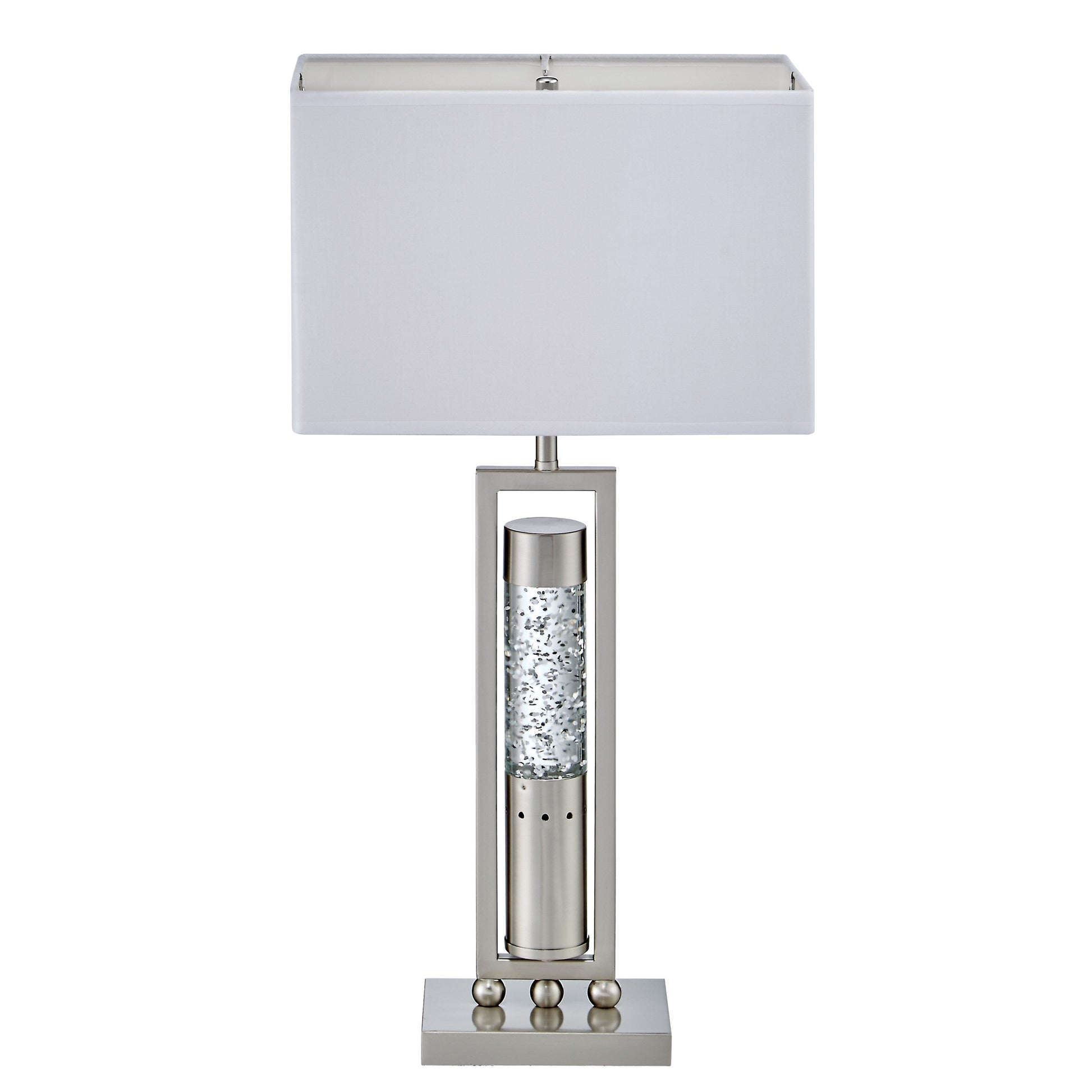 This accent lighting can change the ambiance of any room. Its ultra modern design showcases sparkling decorative mood light, with tiny rippling water-droplets to simulate the soothing dancing water motion. Beautifully crafted stand features high quality satin nickel finish metal and glass, and an elegant rectangular lamp shade. 4-position light control switch allows for 4 modes - Top Light On, Base Light On, Both On, and Both Off. Great addition piece on your night stand, end table, or sofa table. It offers flexible lighting solution: a table lamp with a main light that is suitable for reading, perfect for a night light, and to create the mood in any room.