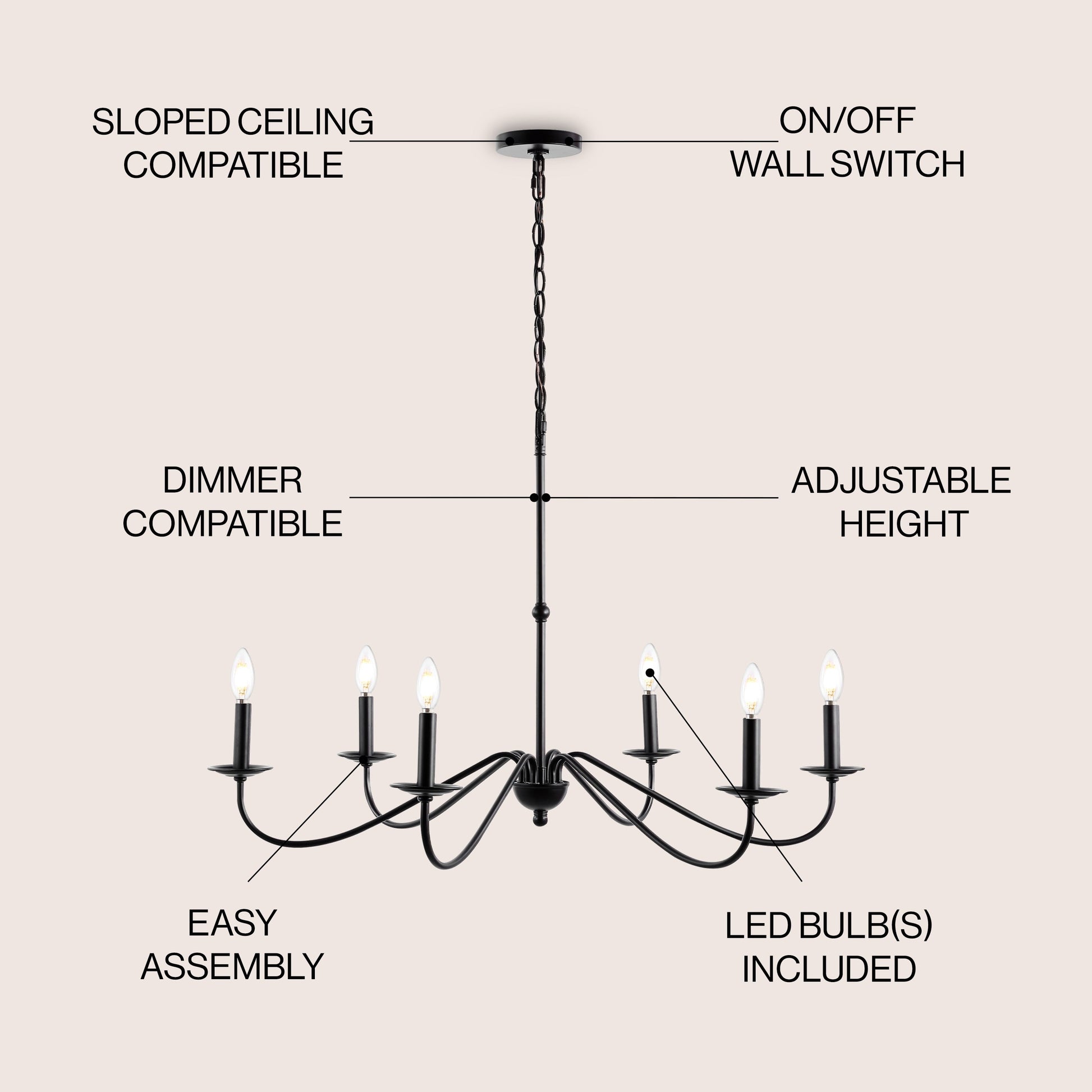 • Adjustable-height chandelier works best for ceilings up to twelve feet high