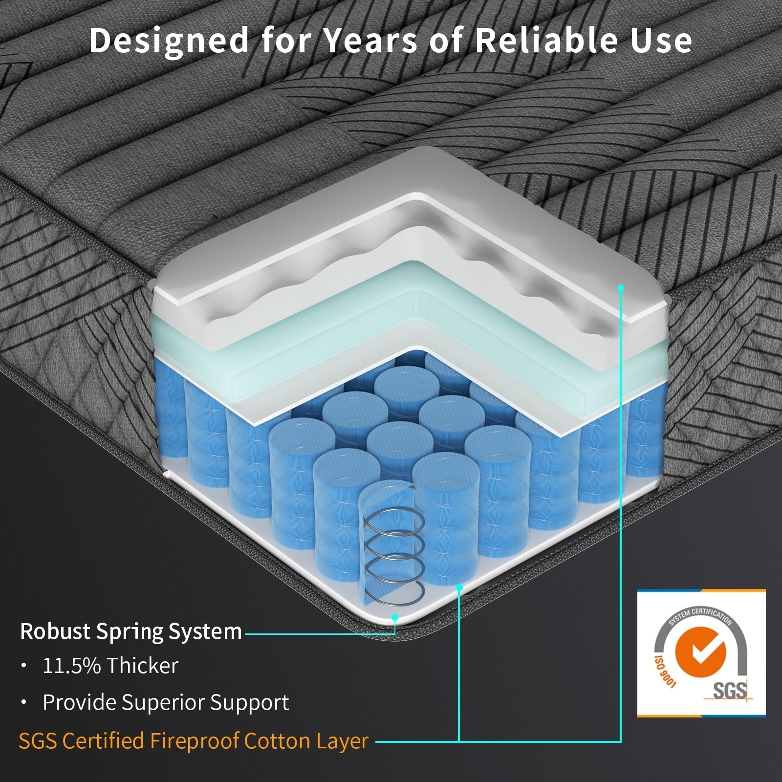 Coil springs 11.5% thicker than market standard: Provides better support, longer lifespan, and prevents collapsing.